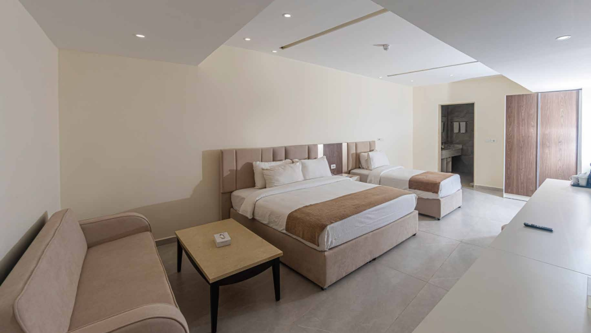 Enjoy the perfect family getaway in our spacious Family Suite, designed to accommodate up to 5 guests. Featuring multiple sleeping areas, a comfortable living space, two 65-inch Smart TVs, and modern amenities, it offers everything your family needs for a relaxing and enjoyable stay.